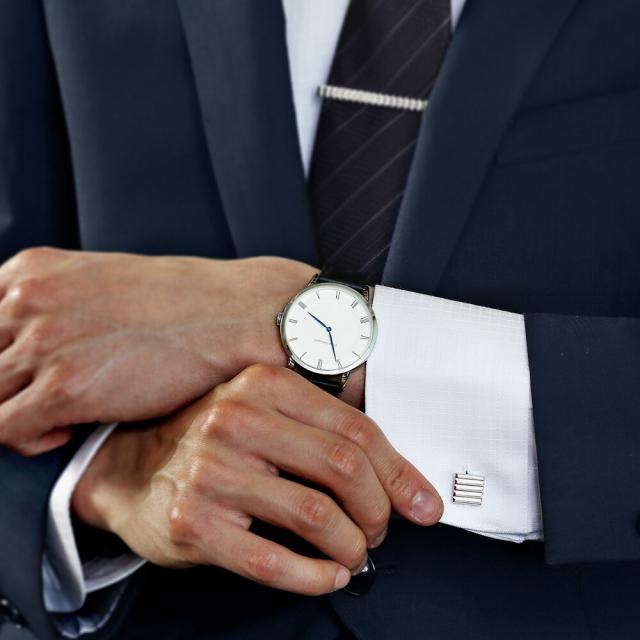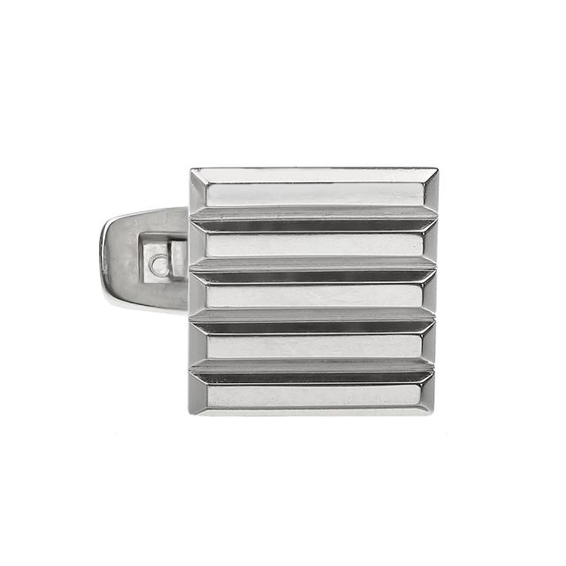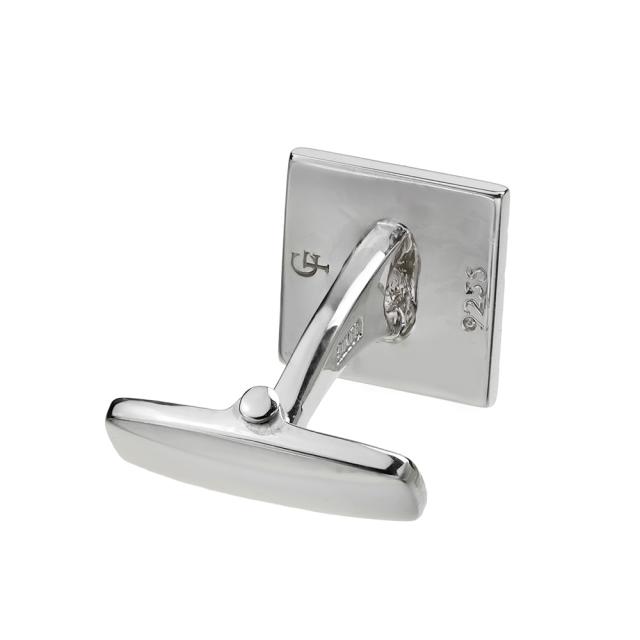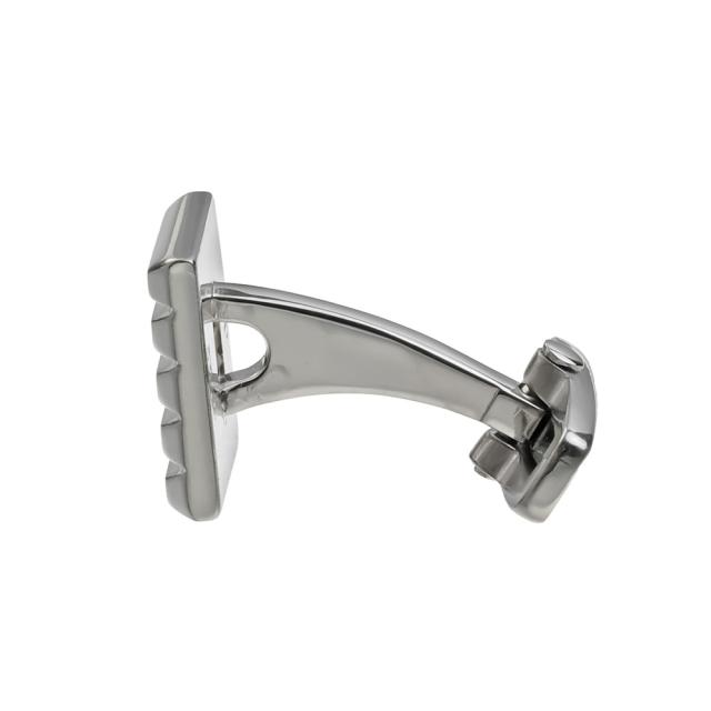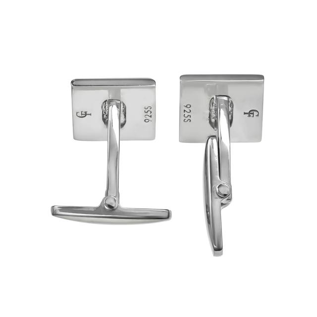 FLUIが送る、ラグジュアリーな輝きが魅力的なシルバー925製カフス。プラチナ等によく用いられる仕法・ロジウムコーティングが、高級感のある美しい輝きを生み出します。シンプルなストライプ柄のようでありながら、エッジや溝まで光を受けて輝くように計算されています。カフスは一般的なスウィヴル式を採用。T字状の留め具をまっすぐにした状態でボタン穴に差し込み、再びT字状に戻して留めます。留め具部分もシルバー925製です。洗練された正方形のフォルムに宿る輝きは、袖元に上品さと華やかさを演出してくれます。