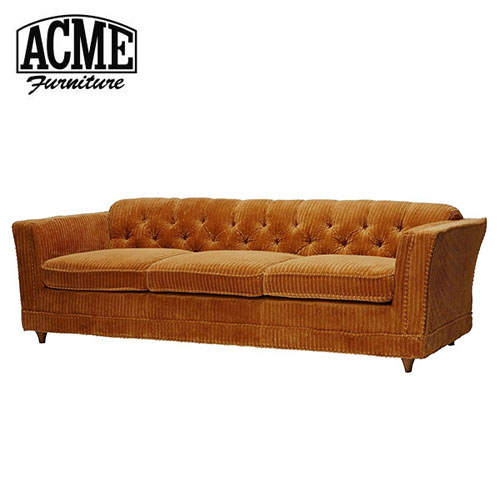 デザインには背中をボタン締めした「チェスターフィールド」を採用し。レザーだとクラシックで重厚なデザインになりますが、あえてコーデュロイにすることで絶妙なポップ感を出しました。ACMEらしい遊び心のある、カリフォルニア版チェスターフィールドソファです。部屋に置くだけでインパクトが出る主役級ソファです。