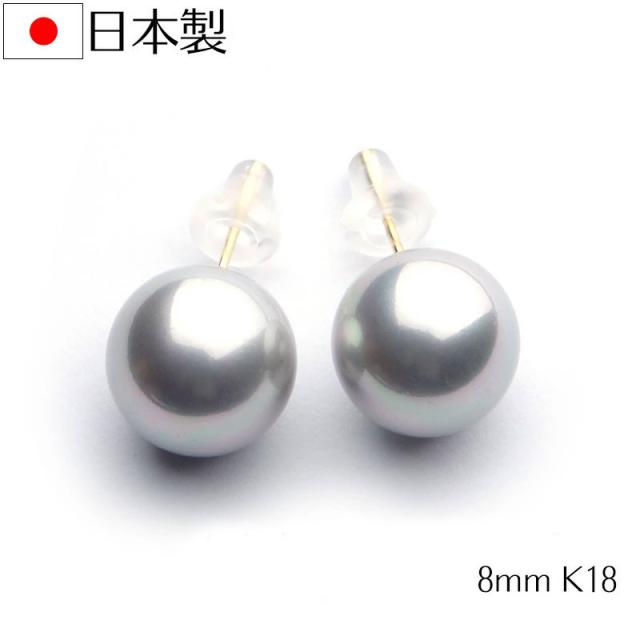 日本製 8mmシルバーグレー 本貝パール K18ポストピアス シリコンキャッチ 18金