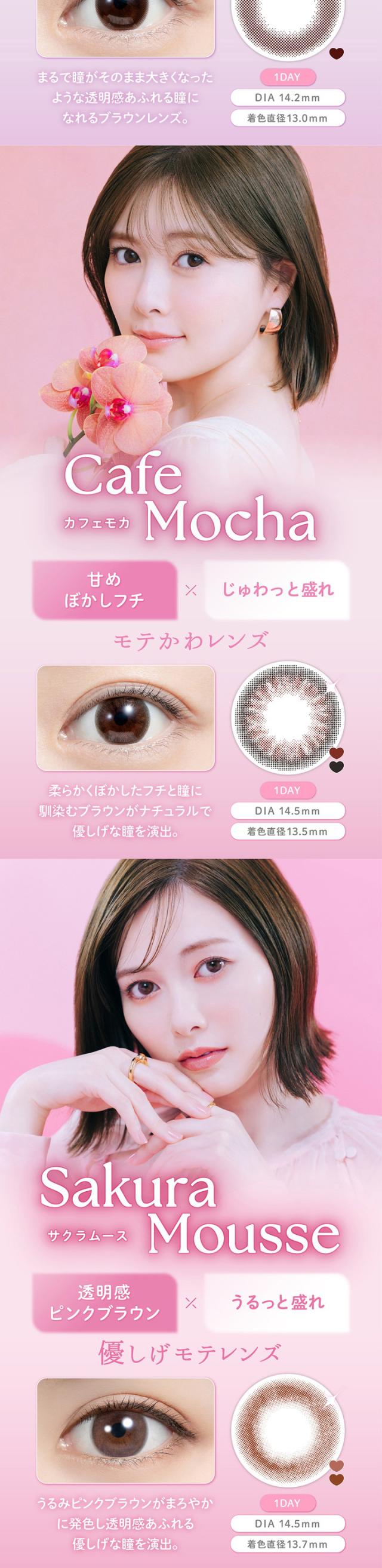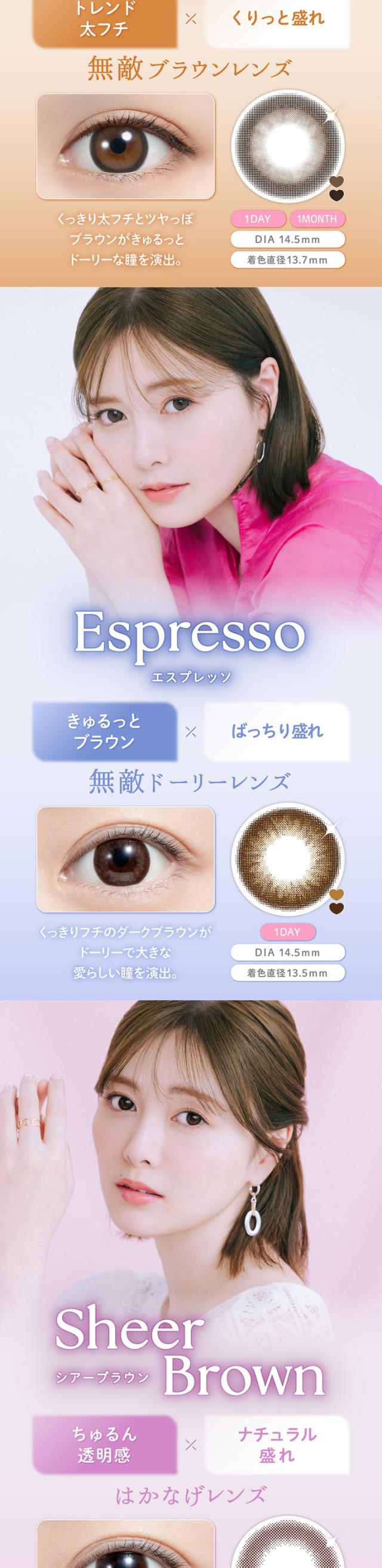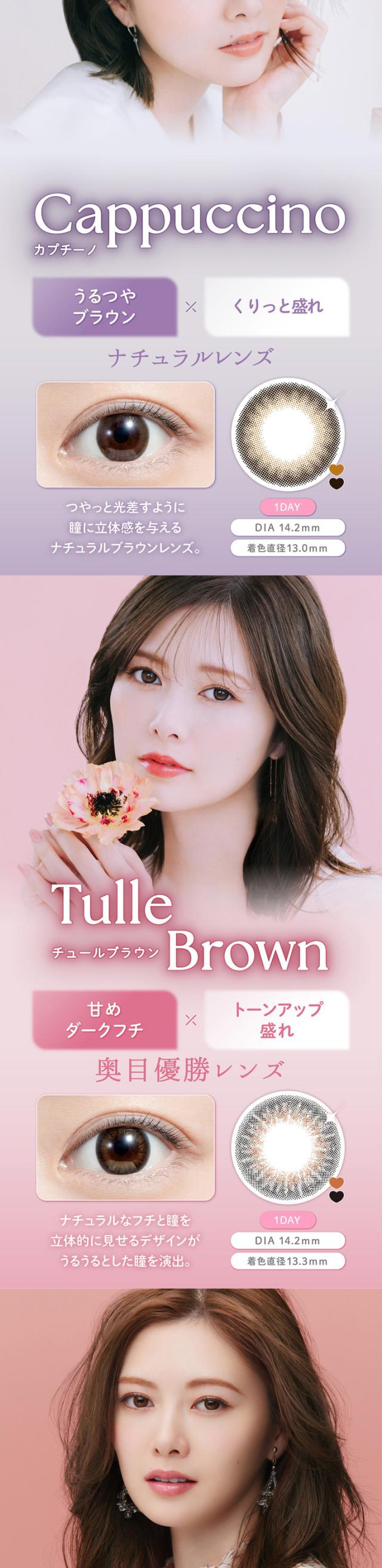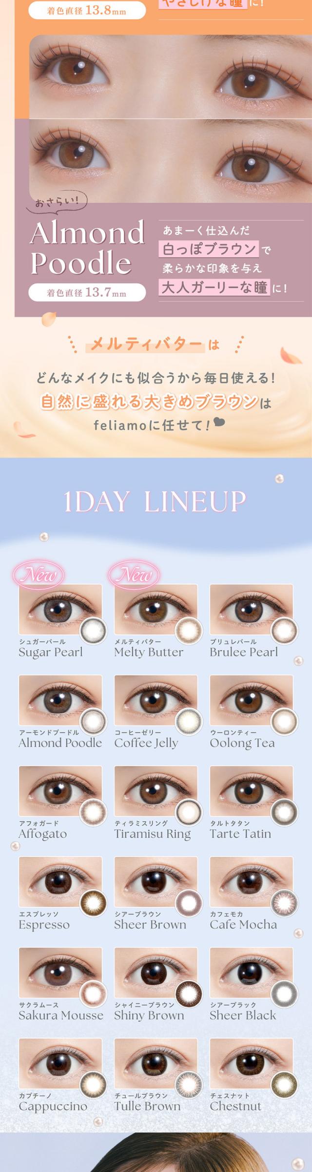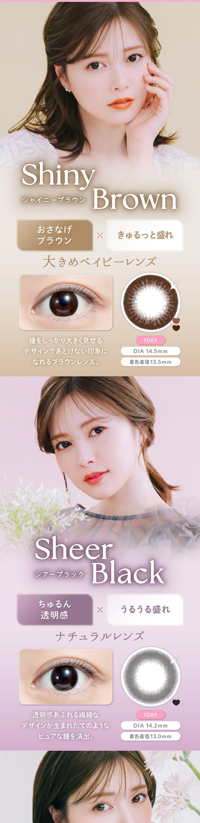 ■カラー:シアーブラック、シアーブラウン、カプチーノ、エスプレッソ、シャイニーブラウン、チュールブラウン、カフェモカ、チェスナット、アフォガード、コーヒーゼリー、サクラムース、ティラミスリング、ウーロンティー、タルトタタン、アーモンドプードル、ブリュレパール、シュガーパール、メルティバター