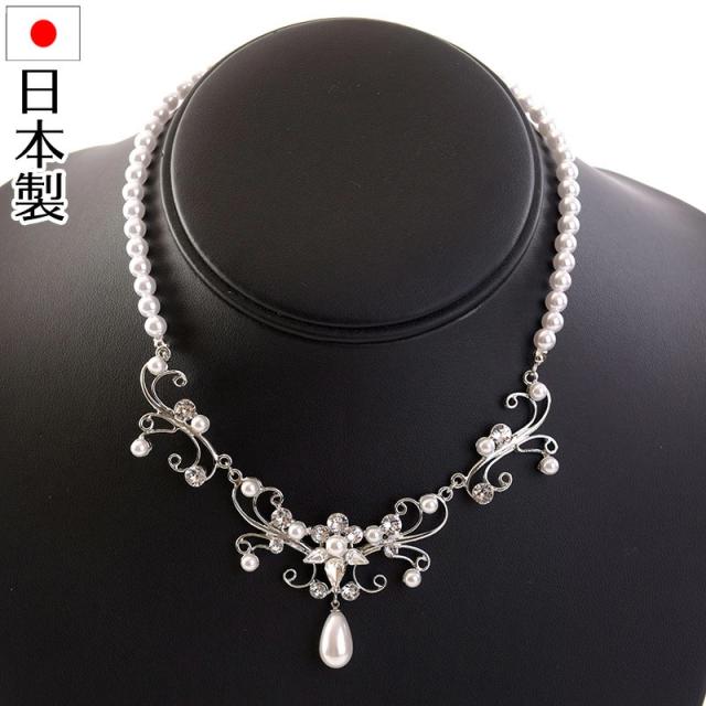 日本製ネックレスが驚きの価格で登場!クリスタルは全粒スワロフスキーを使用!金属パーツ類も国内工場で組んでいますので非常に丁寧で好感が持てます。メッキ仕上げも当然国内ですのでフレーム部分の発色もきれいです。曲線を描くフォルムに繊細さを感じさせるネックレス。パールビーズはウェディングドレスとの相性も〇