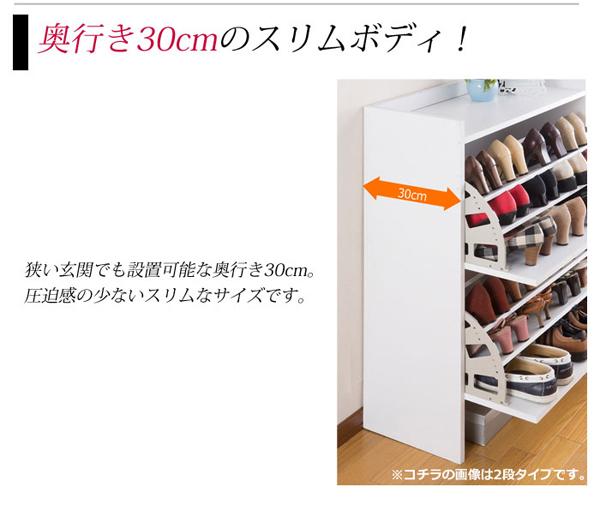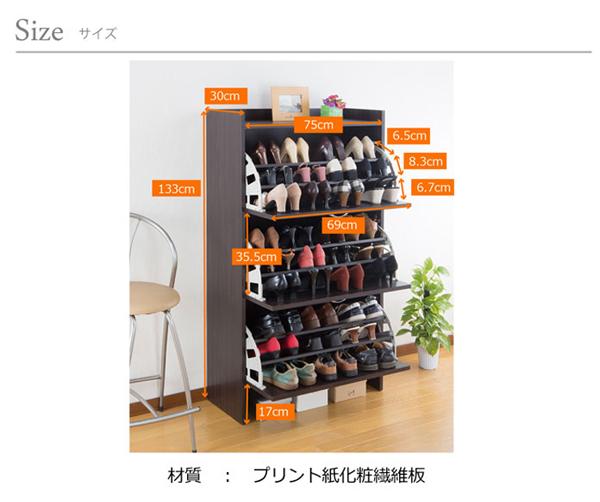 薄型・立体収納で最大36足、狭い玄関でも設置可能な奥行き30cmのシューズラックです。フラップ扉は1段で最大12足収納、各フラップには仕切り板が2枚付き靴に合わせて調節可能です。靴のサイズは外寸で最大32cmが収納可能。各段の背に通気孔を装備し靴の臭いを換気して湿気を逃がし靴を快適に保つことが出来ます。背面も表と同じプリント紙化粧仕上げです。