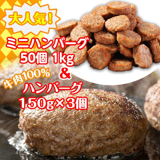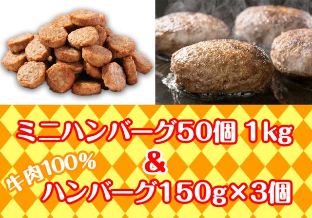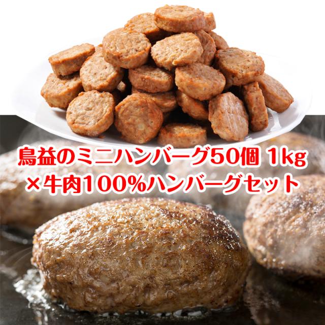 【送料無料】朝食、夕食お試し ハンバーグセット(ミニハンバーグ50個 1kg×牛肉100% 焦げ目付きハンバーグ150g×3パック)レンジ調理OK 簡単調理 肉 訳あり お弁当 お試し パーティー 鳥益 お取り寄せグルメ