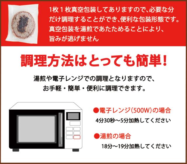 | 【ハンバーグ】 (温める)凍ったままお皿に並べ、5個で約1分30秒温める。 (揚げる)解凍後、160度の油で約2分、凍ってる場合は約3分30秒揚げて下さい。 (焼き)解凍後、油を引いたフライパンでフタをして、約4分、弱火で両面を蒸し焼きにしてください。 【牛肉100%ハンバーグ】 湯煎の場合→18〜19分加熱 電子レンジ(500W)の場合→4分30秒〜5分間加熱 | |