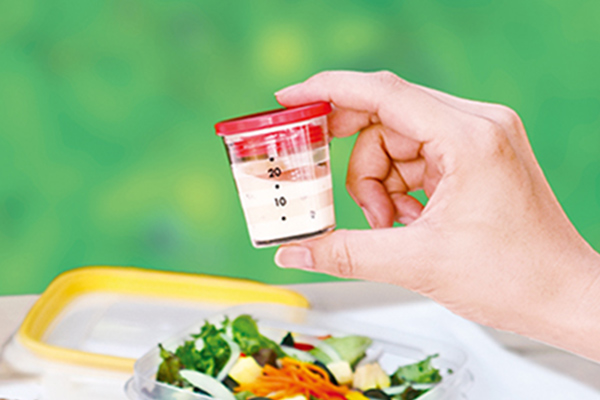 1回分のドレッシングを作ってそのまま持ち運べるランチ用ドレッシングカップです。食べる時にドレッシングをかけるので、新鮮でおいしいサラダがお弁当で食べられます。