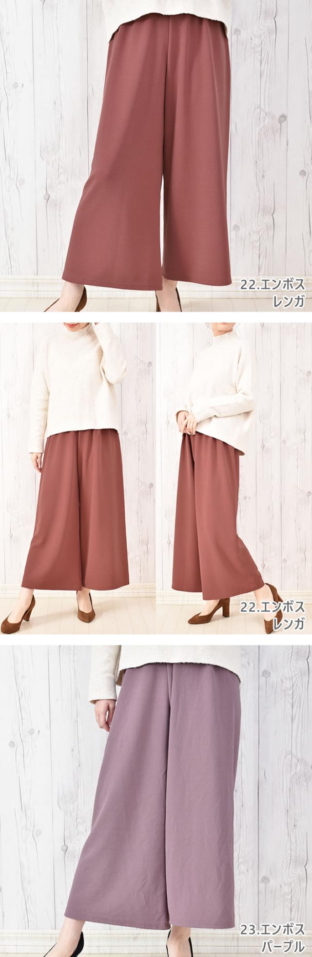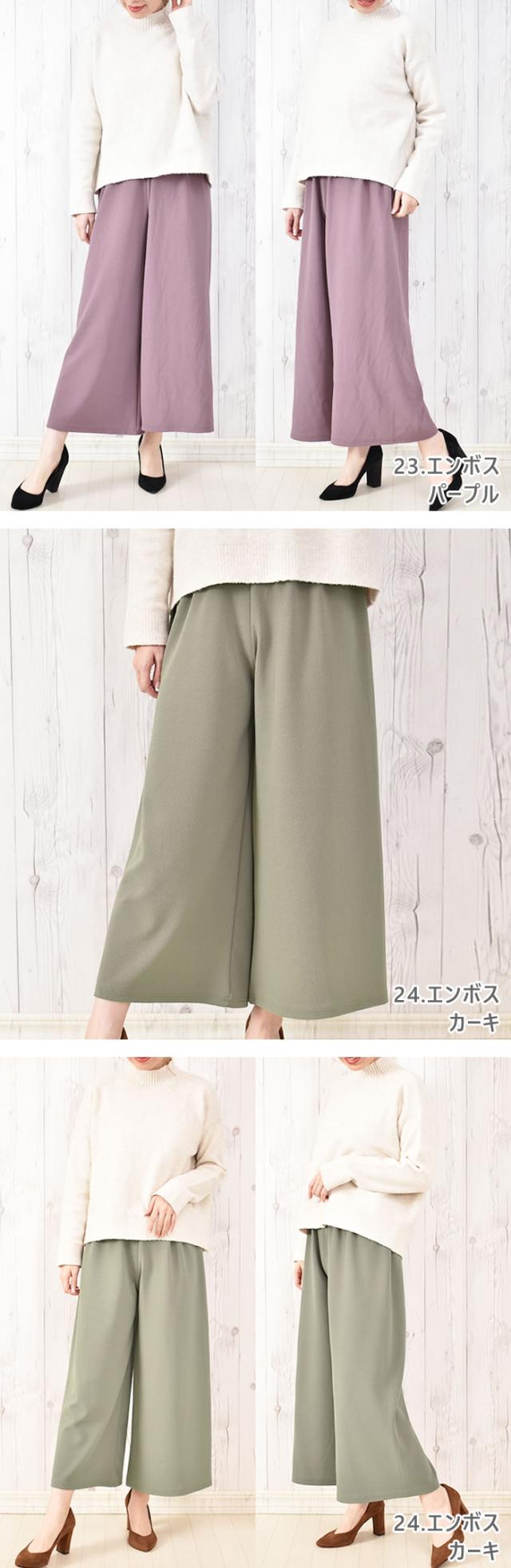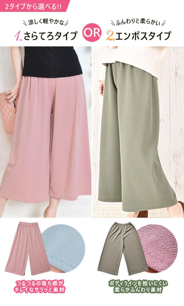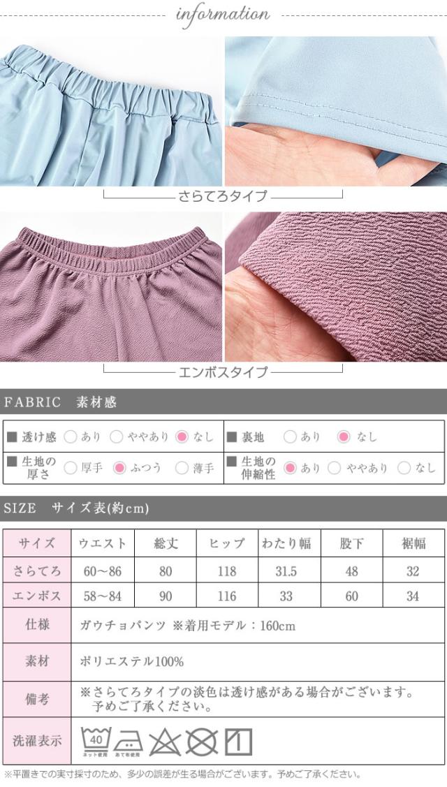 ■サイズ:さらてろ(約)ウエスト60〜86cm・総丈80cm・ヒップ118cm・わたり幅31.5cm・股下48cm・裾幅32cm エンボス(約)ウエスト58〜90cm・総丈89cm・ヒップ116cm・わたり幅33cm・股下62cm・裾幅33cm