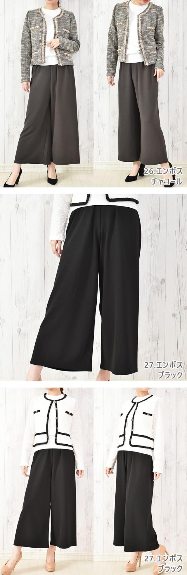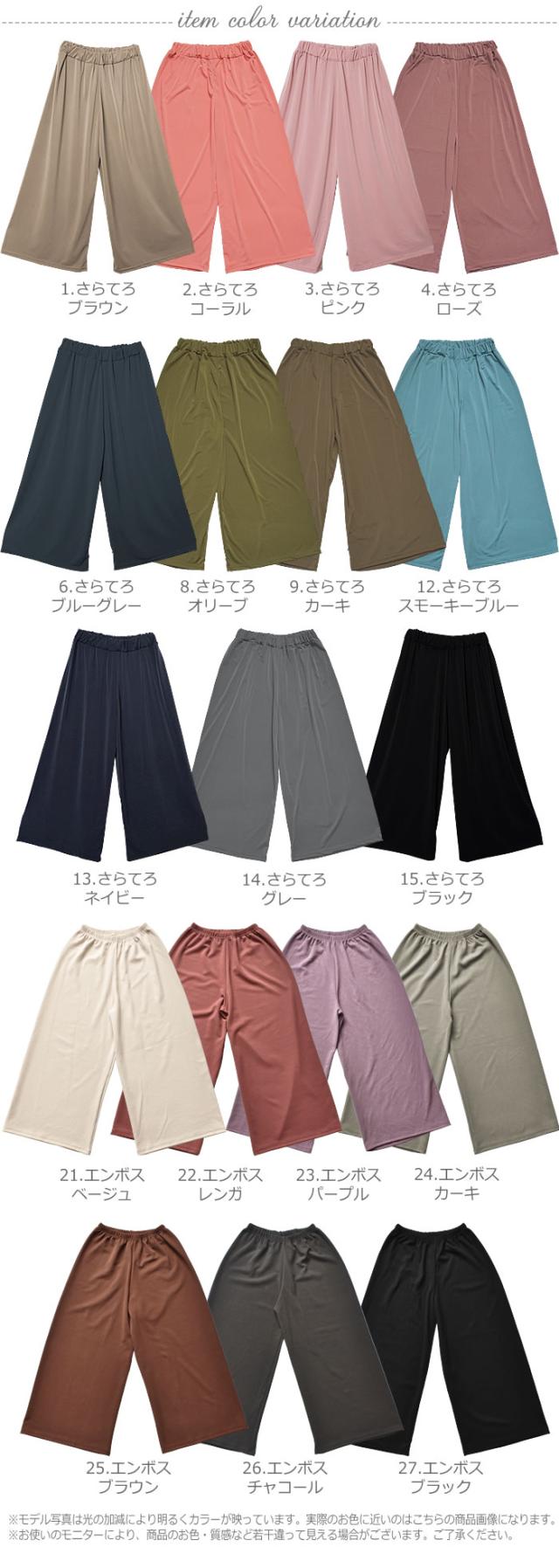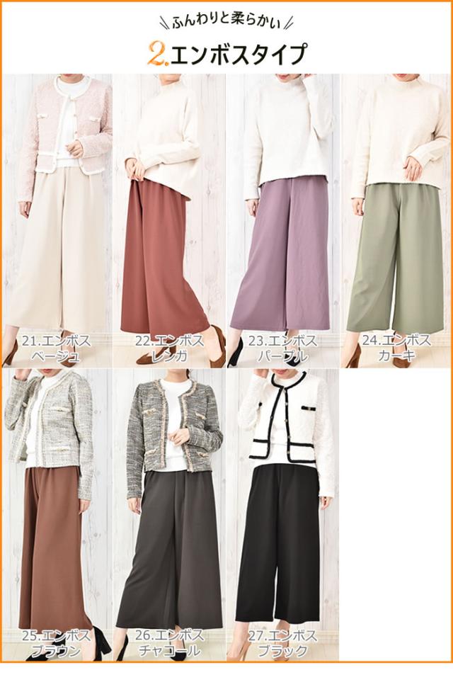 ■サイズ:さらてろ(約)ウエスト60〜86cm・総丈80cm・ヒップ118cm・わたり幅31.5cm・股下48cm・裾幅32cm エンボス(約)ウエスト58〜90cm・総丈89cm・ヒップ116cm・わたり幅33cm・股下62cm・裾幅33cm
