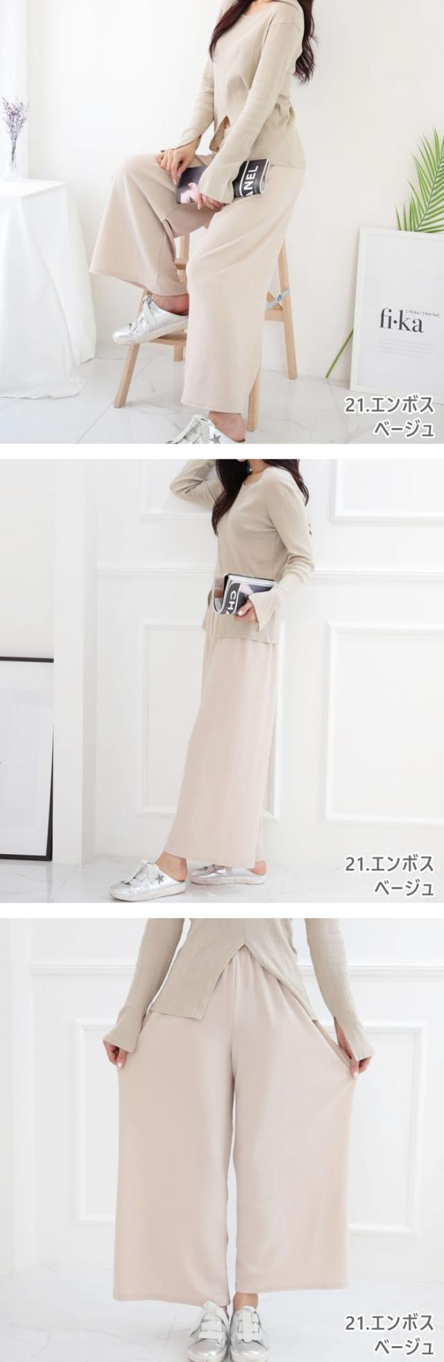 | サイズ | さらてろ(約)ウエスト60〜86cm・総丈80cm・ヒップ118cm・わたり幅31.5cm・股下48cm・裾幅32cm エンボス(約)ウエスト58〜90cm・総丈89cm・ヒップ116cm・わたり幅33cm・股下62cm・裾幅33cm |