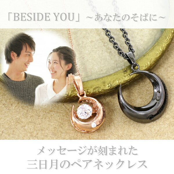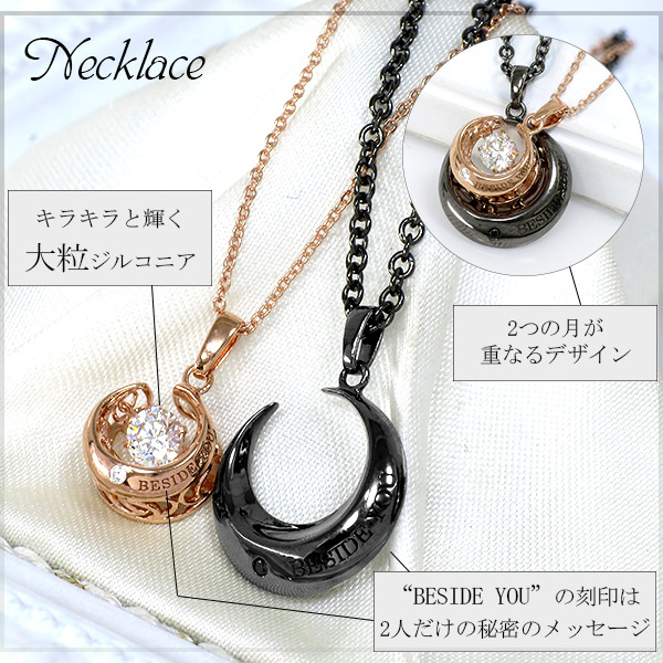 高級感のあるローズのジュエリーケースとセットになった、三日月モチーフのペアネックレスです。