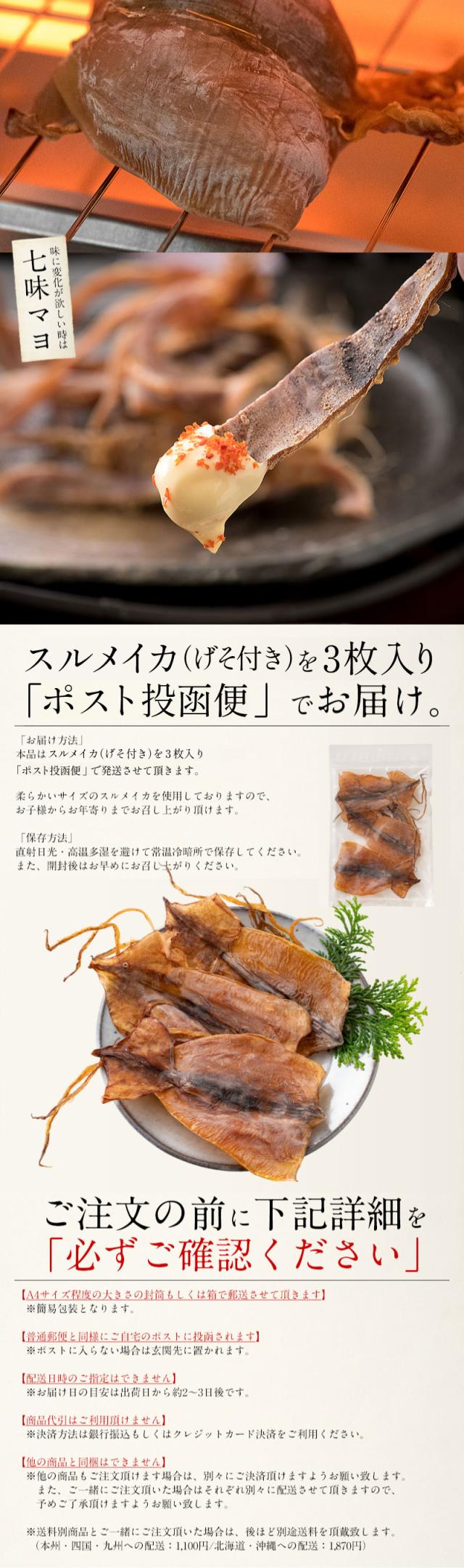 するめいか 3枚入 げそ付き スルメイカ あたりめ 干物[ゆうパケット][配送日時指定不可・商品代引不可・同梱不可] ギフト プレゼント お歳暮