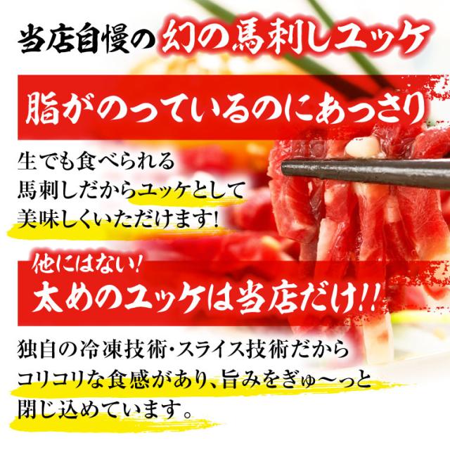 - 馬刺しはこちらのショップさんから何度か購入していただきましたがユッケは生まれて初めて食べました。美味しいですね。また購入したいと思います。