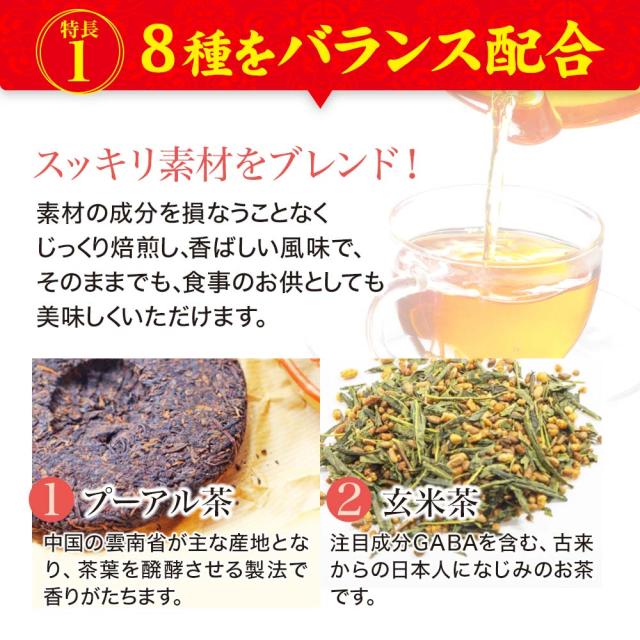 本品は、玄米茶、プーアル茶、杜仲茶、桑の葉茶さらにどくだみ茶、グァバ茶、ハトムギ、黒豆を配合した減肥茶です。素材の成分を損なうことなくじっくり焙煎し、香ばしい風味で食事などに良く合い、ダイエットサポート茶として皆様の健康と美容に最適です。