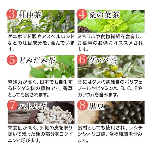 | プーアル茶、玄米茶、杜仲茶、桑の葉茶、どくだみ茶、グァバ茶、ハトムギ、黒豆 |