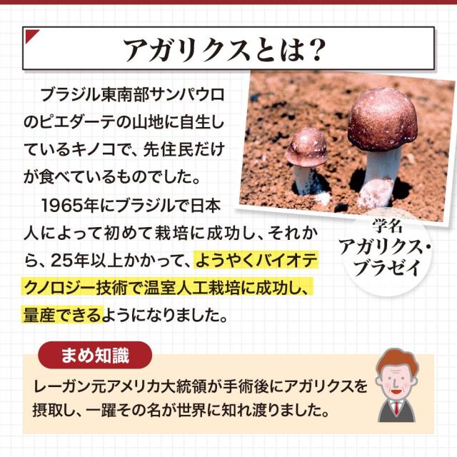 ブラジルのサンパウロ郊外の山地に自生していたキノコで、先住民だけが食べていました。1965年にブラジルで日本人によって初めて栽培に成功したキノコで、学名は「アガリクス・ブラゼイ」です。25年以上かかって、ようやくバイオテクノロジー技術で温室人工栽培に成功し、量産できるようになりました。アメリカのレーガン大統領が手術後の摂取にて一躍その名が世界に知れ渡りました。
