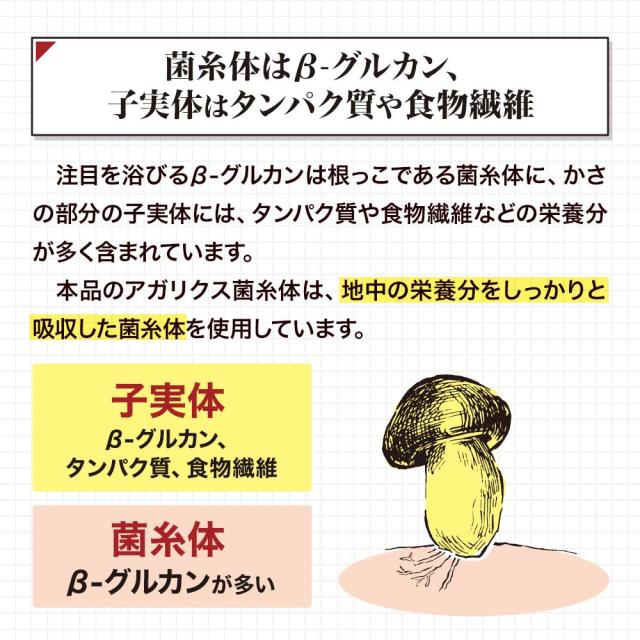 大きな注目を浴びているアガリクスの主要成分であるβ-グルカンを抽出するために、従来はかさ(子実体)の部分のものが多く利用されていました。しかし、実は根っこである菌糸体に子実体よりも多くのβ-グルカンが含まれることが、研究の結果わかったのです。アガリクス菌糸体は、地中の栄養分を吸収し成分を豊富に含む菌糸体を使用している点が、まず従来と大きく違います。一方子実体には、タンパク質や食物繊維などの栄養分が含まれています。