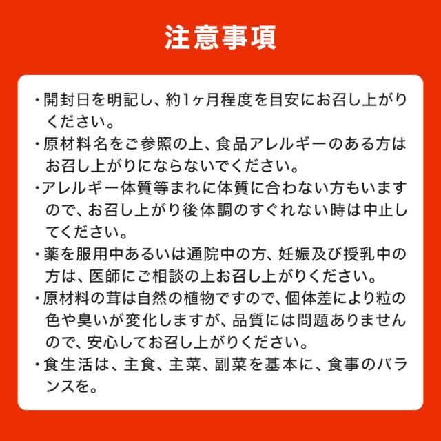 | ●開封日を明記し、1個あたり約1ヶ月程度を目安にお召し上がりください。 ●原材料名をご参照の上、食品アレルギーのある方はお召し上がりにならないでください。 ●アレルギー体質等まれに体質に合わない方もいますので、お召し上がり後体調のすぐれない時は中止してください。 ●薬を服用中あるいは通院中の方、妊娠及び授乳中の方は、医師にご相談の上お召し上がりください。 ●原材料の茸は自然の植物ですので、個体差により粒の色や臭いが変化しますが、品質には問題ありませんので、安心してお召し上がりください。 ●食生活は、主食、主菜、副菜を基本に、食事のバランスを。 |