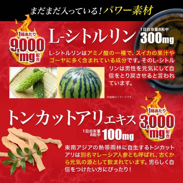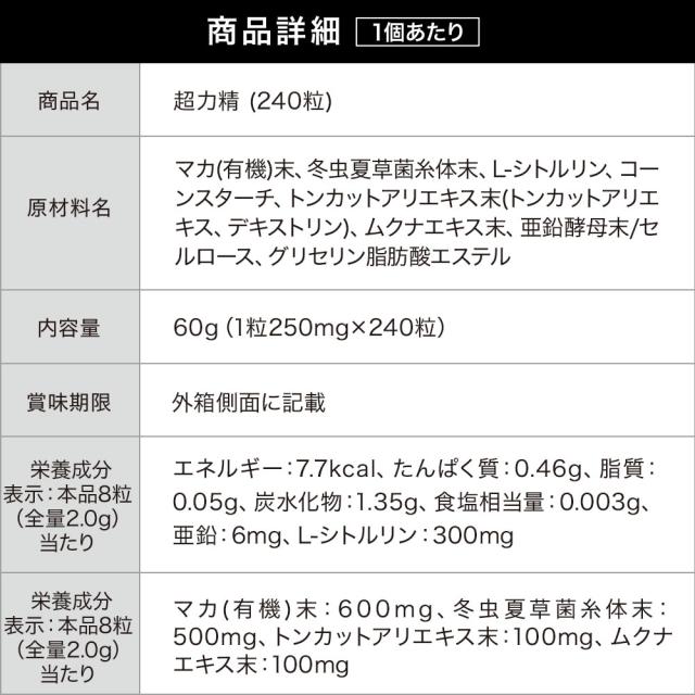 | マカ(有機)末、冬虫夏草菌糸体末、L-シトルリン、コーンスターチ、トンカットアリエキス末(トンカットアリエキス、デキストリン)、ムクナエキス末、亜鉛酵母末/セルロース、グリセリン脂肪酸エステル |