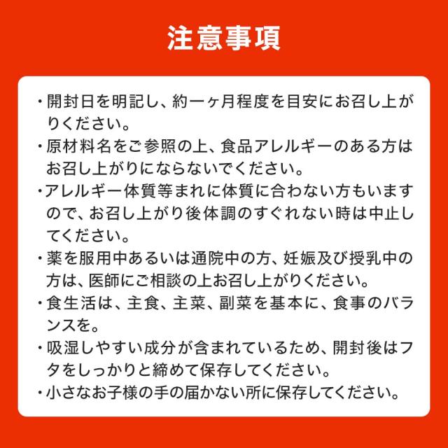 | ●開封日を明記し、1個あたり約一ヶ月程度を目安にお召し上がりください。 ●原材料名をご参照の上、食品アレルギーのある方はお召し上がりにならないでください。 ●アレルギー体質等まれに体質に合わない方もいますので、お召し上がり後体調のすぐれない時は中止してください。 ●薬を服用中あるいは通院中の方、妊娠及び授乳中の方は、医師にご相談の上お召し上がりください。 ●食生活は、主食、主菜、副菜を基本に、食事のバランスを。 |