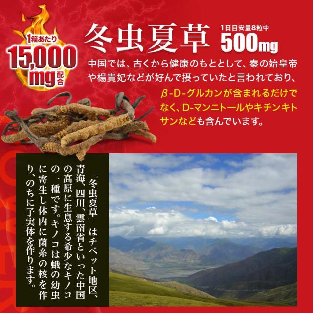 | マカ(有機)末:600mg、冬虫夏草菌糸体末:500mg、、トンカットアリエキス末:100mg、ムクナエキス末:100mg |