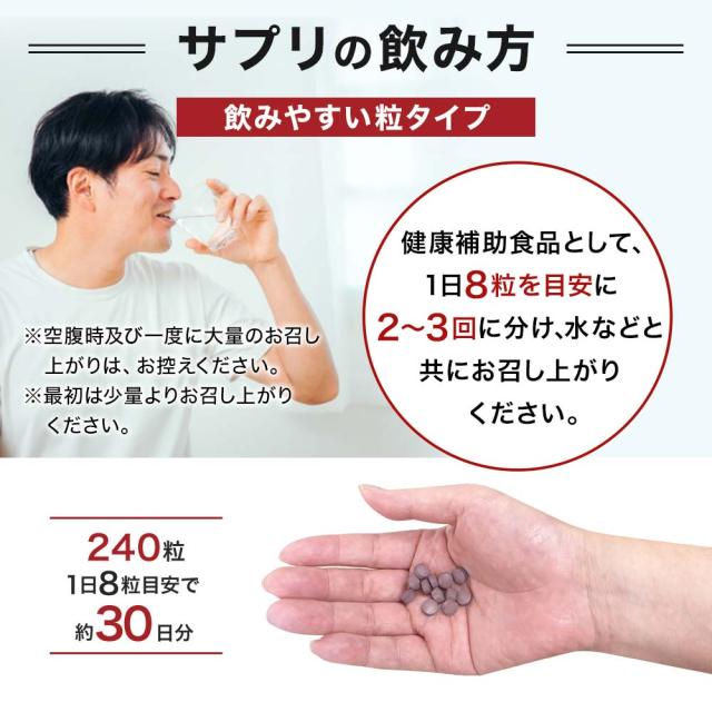 | ●健康補助食品として、一日8粒を目安に2〜3回に分け、水などと共にお召し上がりください。 ●空腹時及び一度に大量のお召し上がりは、お控えください。 ●最初は少量よりお召し上がりください。 |