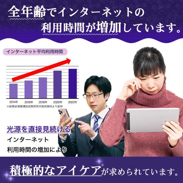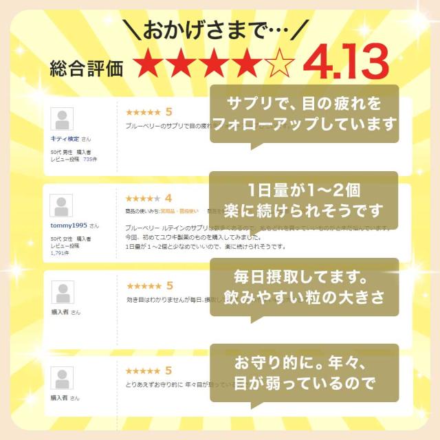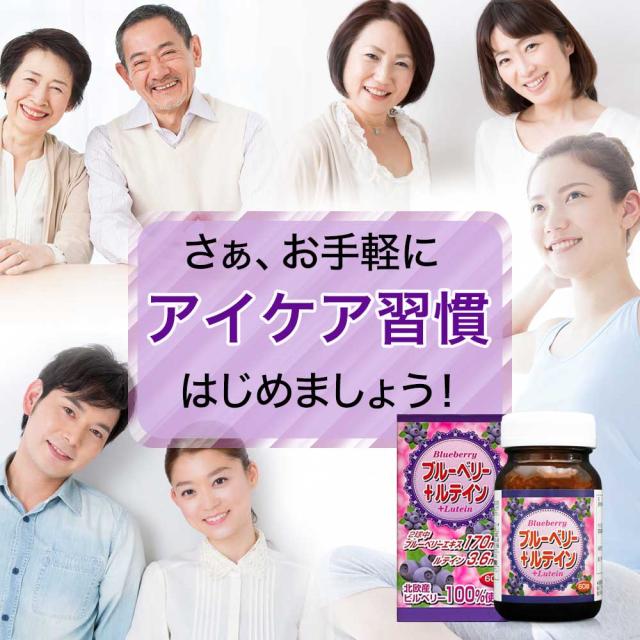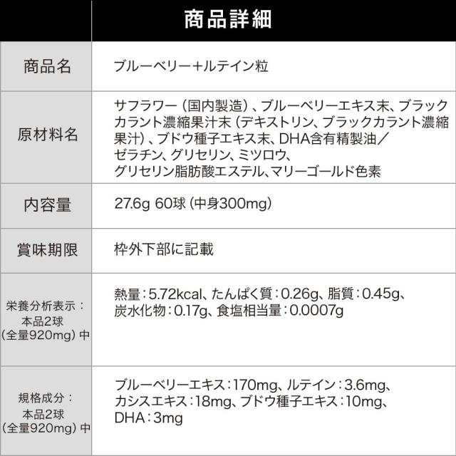 | ブルーベリーエキス:170mg、ルテイン:3.6mg、カシスエキス:18mg、ブドウ種子エキス:10mg、DHA:3mg |