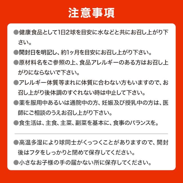 | ●健康補助食品として、一日2球を目安に、水などと共にお召し上がりください。 ●空腹時及び一度に大量のお召し上がりは、お控えください。 ●最初は少量よりお召し上がりください。 |