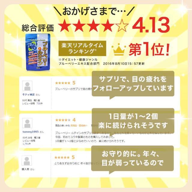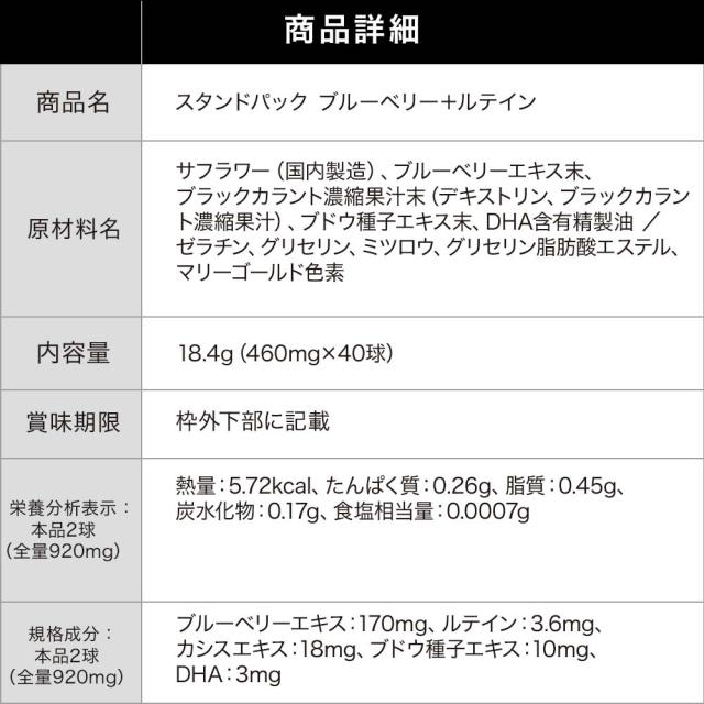 | ブルーベリーエキス末:170mg、ルテイン:3.6mg、カシスエキス:18mg、ブドウ種子エキス:10mg、DHA:3mg |