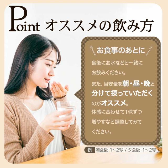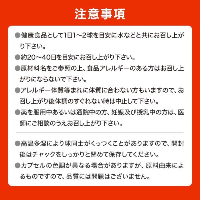 | ●健康補助食品として、一日1〜2球を目安に、水などと共にお召し上がりください。 ●空腹時及び一度に大量のお召し上がりは、お控えください。 ●最初は少量よりお召し上がりください。 |