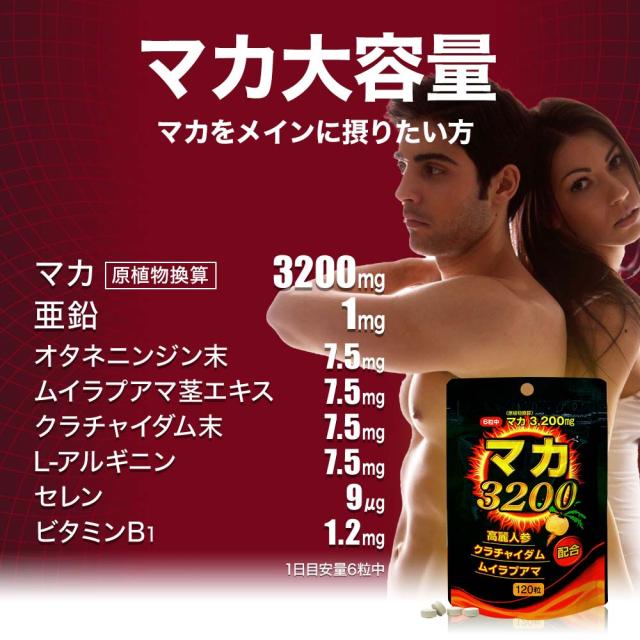 | 有機マカ:250mg、L-シトルリン:160mg、トンカットアリエキス:50mg、ムクナエキス:50mg、亜鉛:2mg |