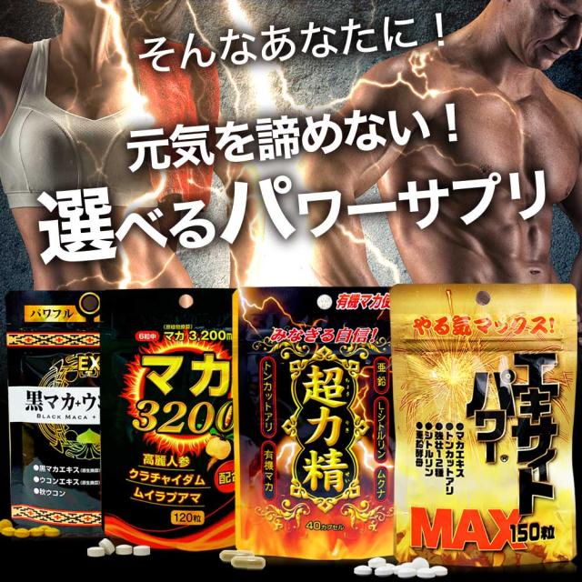 人気のパワーサプリ「超力精、マカ3200、エキサイトパワーMAX、黒マカ+ウコンEX」の中から選べるサプリ!