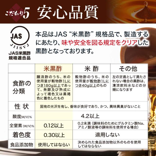 酢は人間が作り出した最初の調味料とも言われ、古来より私達の健康を支える食品として利用されてきました。本品は玄米を使用し昔ながらの製法で、麹菌によるアルコール発酵、酢酸菌による酢酸発酵、約6ヶ月間の静置熟成により、まろやかで美味しい玄米黒酢に仕上げました。