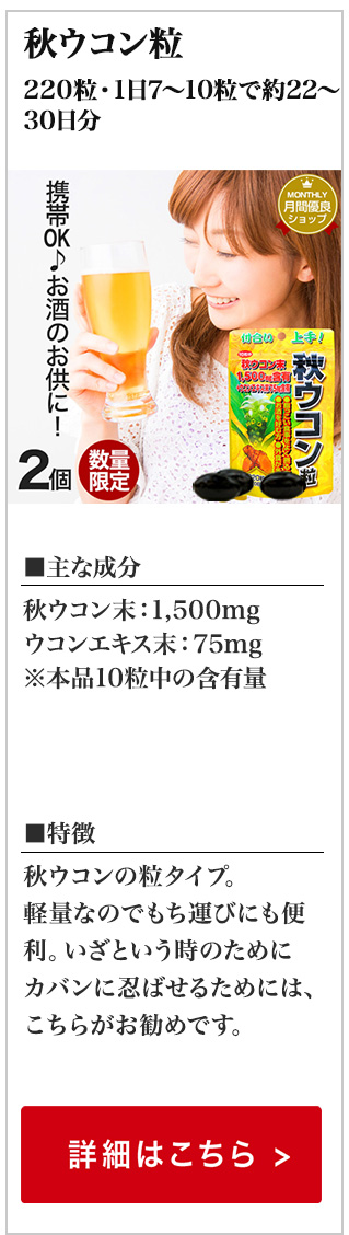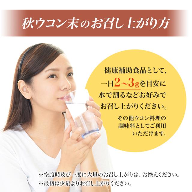 ウコンにはクルクミンと言われる成分が含まれ、特に秋ウコンに多く含まれています。本品は、添加物を加えない100%秋ウコンを使用し、貴重な健康成分をそのまま利用できるように粉末タイプにしました。お酒を飲む機会の多い方、生活が不規則になりがちな方、健康維持や美容を心がけている方々にお勧め致します。