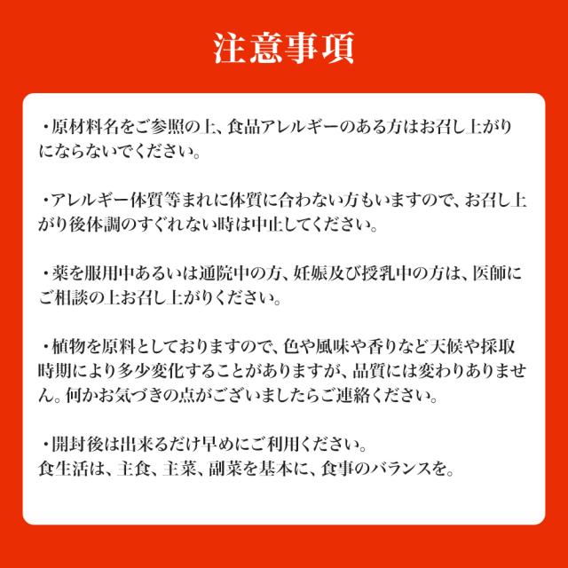 | ●原材料名をご参照の上、食品アレルギーのある方はお召し上がりにならないでください。 ●アレルギー体質等まれに体質に合わない方もいますので、お召し上がり後体調のすぐれない時は中止してください。 ●薬を服用中あるいは通院中の方、妊娠及び授乳中の方は、医師にご相談の上お召し上がりください。 ●植物を原料としておりますので、色や風味や香りなど天候や採取時期により多少変化することがありますが、品質には変わりありません。何かお気づきの点がございましたらご連絡ください。 ●開封後は出来るだけ早めにご利用ください。 ●食生活は、主食、主菜、副菜を基本に、食事のバランスを。 |