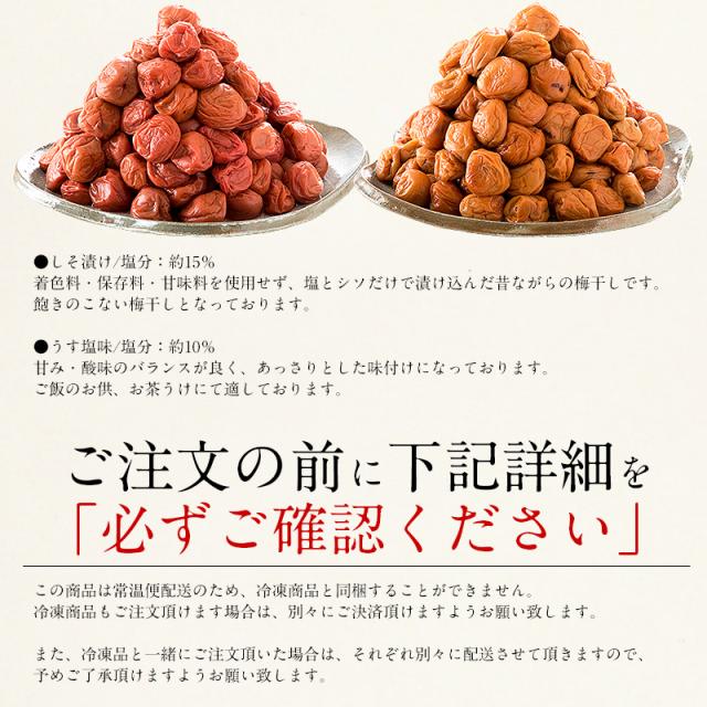 しそ漬け(福井県産梅、食塩、しそ)、うす塩(福井県産梅、食塩、還元水飴、砂糖、発酵調味料、調味料(アミノ酸等)、酸味料、ユッカ抽出物、ビタミンB1、(原料の一部に大豆を含む))
