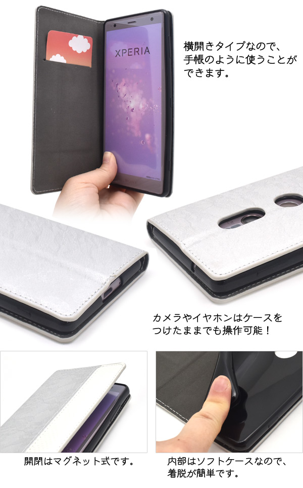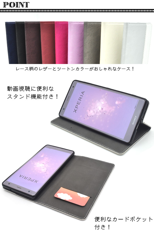 レザー地の上に薄くレース柄がプリントされた上品なケースです。内側はスウェード調になっており手触りも抜群! 内側のケースは衝撃吸収性に優れたTPU製です。※Xperiaは付属しません。※ライセンス商品ではありません。※内側に接着してあるソフトケースの縁が湾曲しているためスマートフォンに はまりきらず、側面から浮いた状態になっています。このため、ケースを装着した状態での電源ボタンの操作が難しくなっています。予めご了承ください。 ※ケースをつけたまま撮影できますが、フラッシュ撮影時にケースの色が移り込むことがあります。