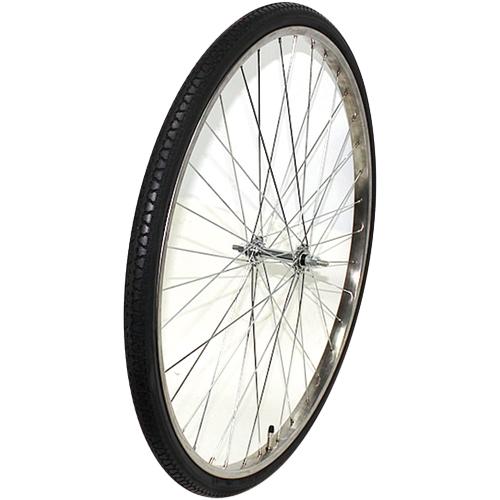 特長:一般軽快車、シティサイクル用の前輪完組みになります。タイヤ・チューブ付きになりますので、装着し、空気圧を調整すればそのままご使用いただけます。補修や交換に是非お役立て下さい。