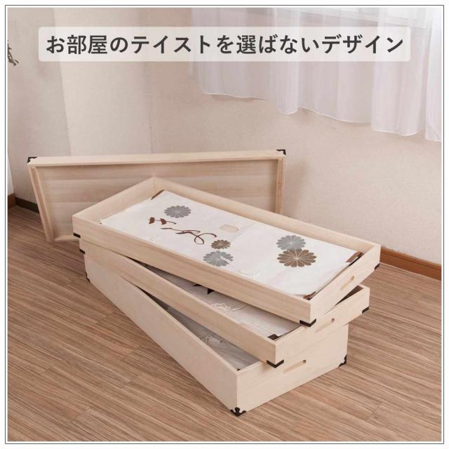 着物や浴衣の収納に定番の桐衣装箱ですが、和洋幅広いシーンにスッと馴染むナチュラルな色合いです。クローゼット上やベッド下などにすっきりと収まるのでスペースの有効活用ができます。