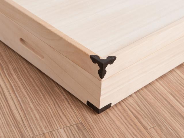 隅には補強の役割も担っている金属製の飾り金具が付いています。細部に至るまで丁寧に仕上げた逸品を長くお楽しみください。