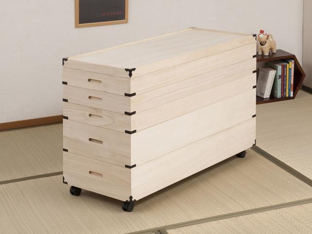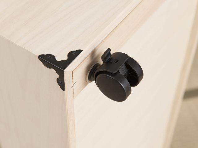 桐は木材の中でも非常に軽いので、持ち運びしやすい特徴がありますです。また、キャスター付きなので押入れやクローゼットへの出し入れもスムーズに行えます。キャスターは取り外し可能でストッパーが付いています。