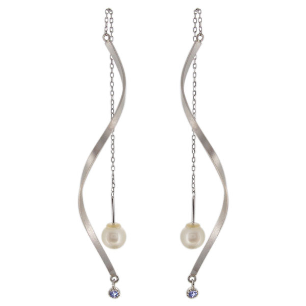 12月誕生石タンザナイトを使用したプラチナ製の、サンドブラストを施した、ロングチェーンピアスです。