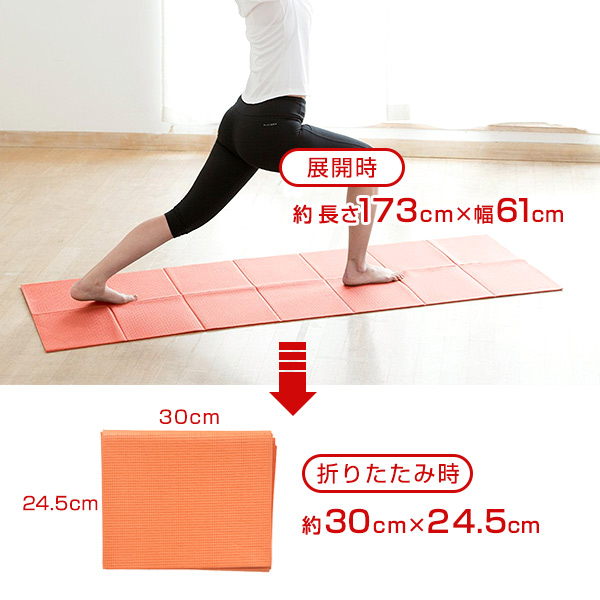 一般的なサイズのヨガマット長さ173cm×幅61cmが、四角く折りたたむと約30cm×24.5cmのコンパクトサイズになります。マットについているラインにそって折りたためるので分かりやすいです。