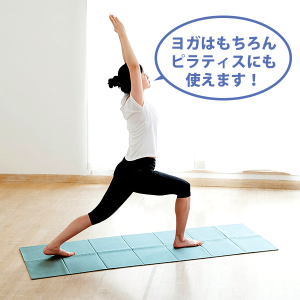 マットは4mmとしっかり厚みがあり、ヨガはもちろんピラティスにもお使いいただけます。スクエアに刻まれた折りたたみのラインはポーズの目安にもなります。