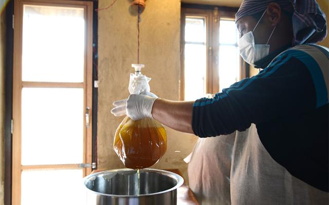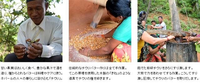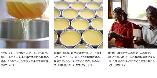 手づくりだからできるセンスの一品、 現地の人だからできる本当に心地いい一品。 チウリ モイスチャークリームは、 ネパール中成分に位置するアスタム村の「はなのいえ」のスタッフによりつくられています。 製品づくりでは、アプリコットオイルとチウリバターを合わせ、ミツロウを加えたものを湯せんして冷やし固めます。 シンプルな製法ですが、シンプルだからこそ目(視覚)や耳(聴覚)、鼻(嗅覚)、手触り(触覚)といった五感を研ぎ澄ます身体的な感覚が必要となります。 子どもの頃から農作業に触れることが多い生活を送り、また手や身体を使い身近な素材を使って生活の道具をも自ら作りだす現地の人々。そこには大変さや不便さもありますが、どこか身体を使い工夫することの楽しさや創造の喜びを感じます。自然と共に生き、自然と向き合うことで日頃から鍛錬された感覚は、製品創りに向き合う時の姿勢に活かされます。 | ||||