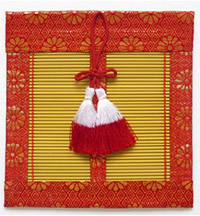 | ■材質 | 金襴(錦赤地菊柄)・人絹赤白一ツ房付・竹 |