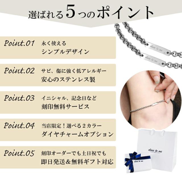 | 商品説明 | ・商品番号 [CTM-SBR11-025A-026A-P] ※価格はペア(2個セット)の価格となります。 ※刻 印の説明画像を参考に、お好きなフォントをお選び下さい。 ※ペアそれぞれ裏面部分に8文字までの刻 印が可能です。 ※ご希望の刻 印文字は商品をお買い物かごに入れた後、ご注文ステップ時の備考欄に、メンズ・レディースそれぞれご記入下さい。 ※ご注文確定後のお客様の都合による刻 印内容の変更、返品・交換にはご対応致しかねます。ご了承ください。 ロールチェーンに小さなプレートをつけたシンプルなペアアンクレット。 プレートにはブランド名close to meの文字が刻まれています。 チェーンとプレートは同じ幅になっているシンプルなデザインなので、 主張しすぎないペアアイテムとして普段使いにもぴったりです。 医療用ステンレス製なのでシルバーアクセサリーにアレルギーをお持ちの方でも安心してご利用頂けます。 ひとつ+1,500円(税別)で天然ダイヤモンド付きチャームをセットでご購入いただけます。 |