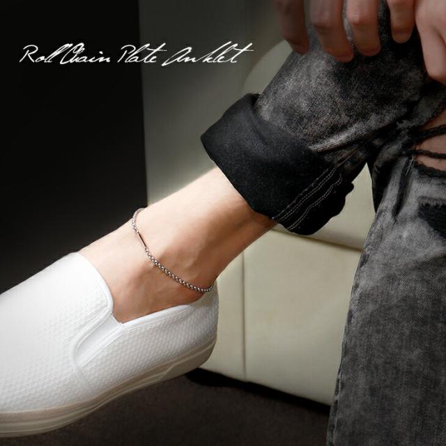 ロールチェーンに小さなプレートをつけたシンプルなペアアンクレット。