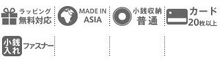 | 備考 | 【メイン開閉】オープン 外側/ フリーポケット×1 カードポケット×1 内側/ 札入れ×1 カードポケット×20 フリーポケット×6 ファスナー小銭入れ×1 | ||
