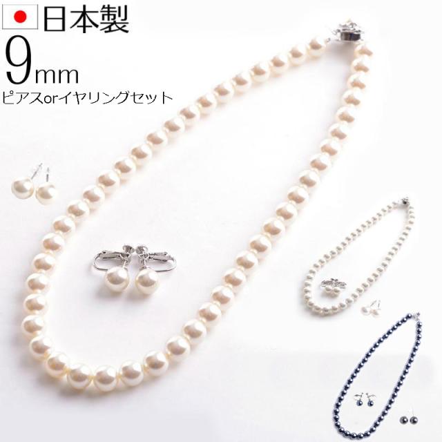 【メール便送料無料】日本製9mm本貝パールネックレス イヤリングorピアスセット 16インチ 職人手作り品