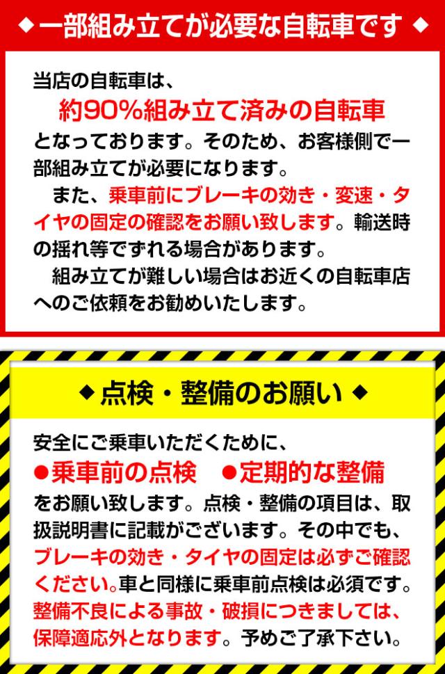 ・全ての自転車は工場出荷状態でのお届けとなる為、ご使用前にブレーキの再度調整をお願いたします。