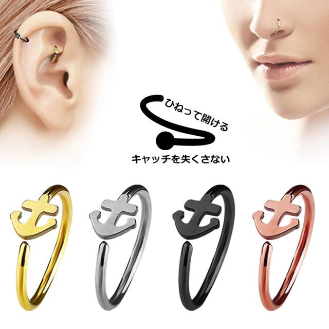 錨をデザインした人気のマリンモチーフをピンクゴールド、イエローゴールド、ブラック、ステンレスカラーのサージカルステンレス316L製の18ゲージのリング型ボディピアスにセット。鼻の横にするノーズリング鼻ピアスや耳の側面の軟骨やコンク、トラガス、リップや口ピアスに最適のボディーピアスです。素材も安心のサージカルステンレス316L.メンズでもレディースでも使えるおしゃれなリングボディピアス。シャフトをツイストさせて装着するタイプなのでキャッチの必要がなく、失くす心配もない。慣れていない人はペンチなどの工具があると便利かも。Gサイズも細いのでファーストピアスやセカンドピアスにも。ペアルックやプレゼントにも。サイズは細いですが乳首ニップルやへそピアスに使っても面白い。
